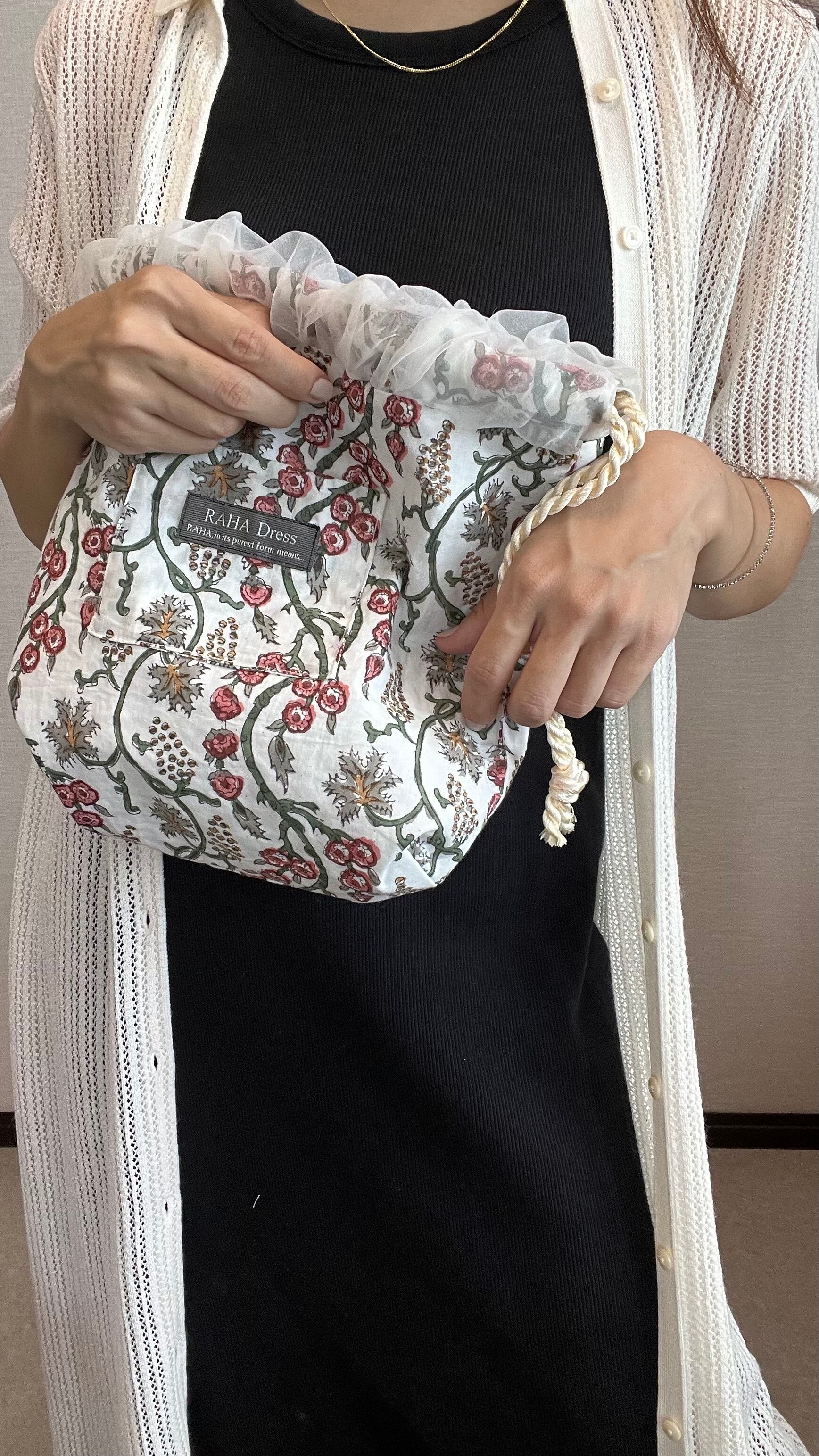 White floral - ブロックプリント ふんわりころんシアー巾着バッグ