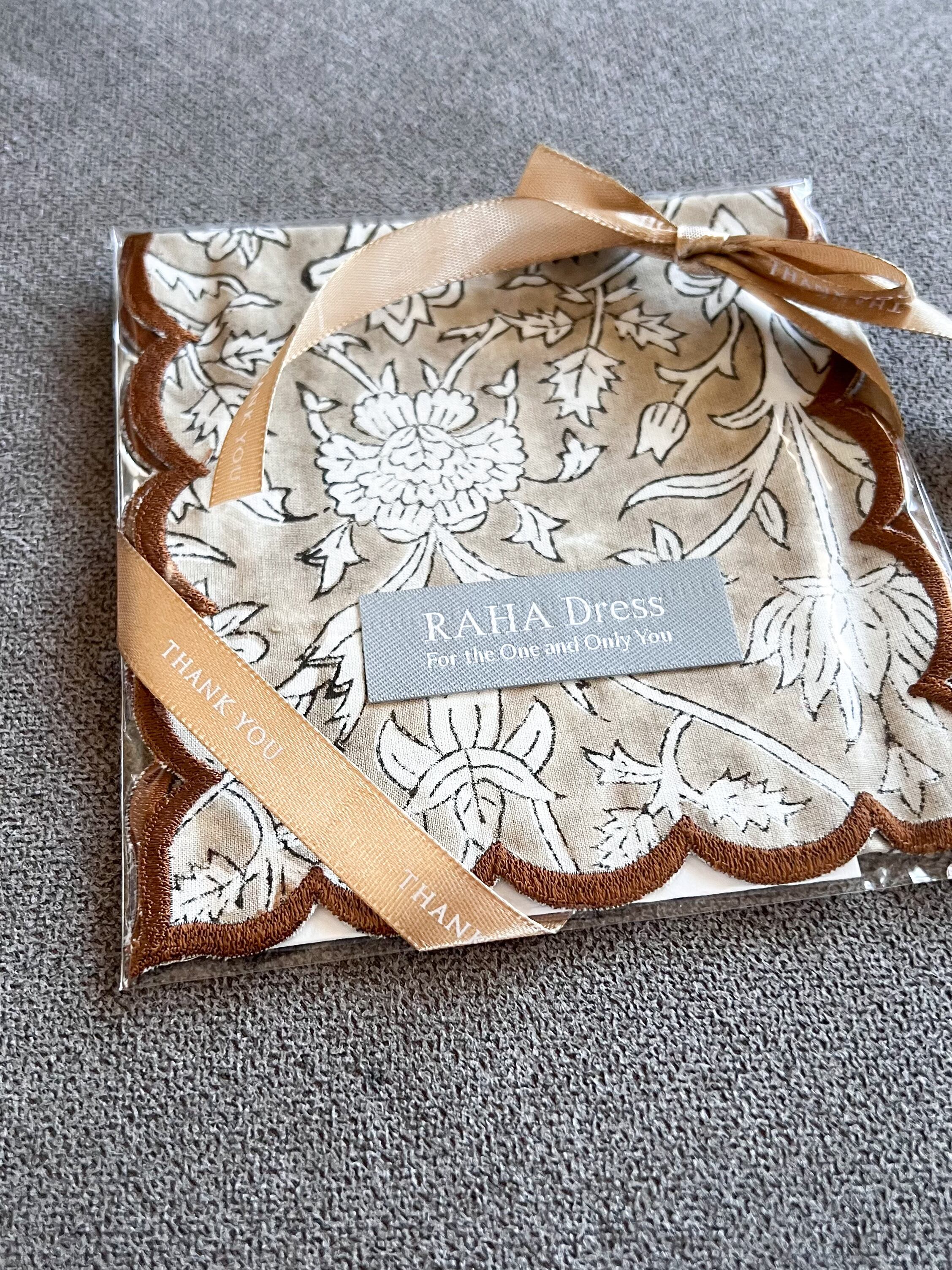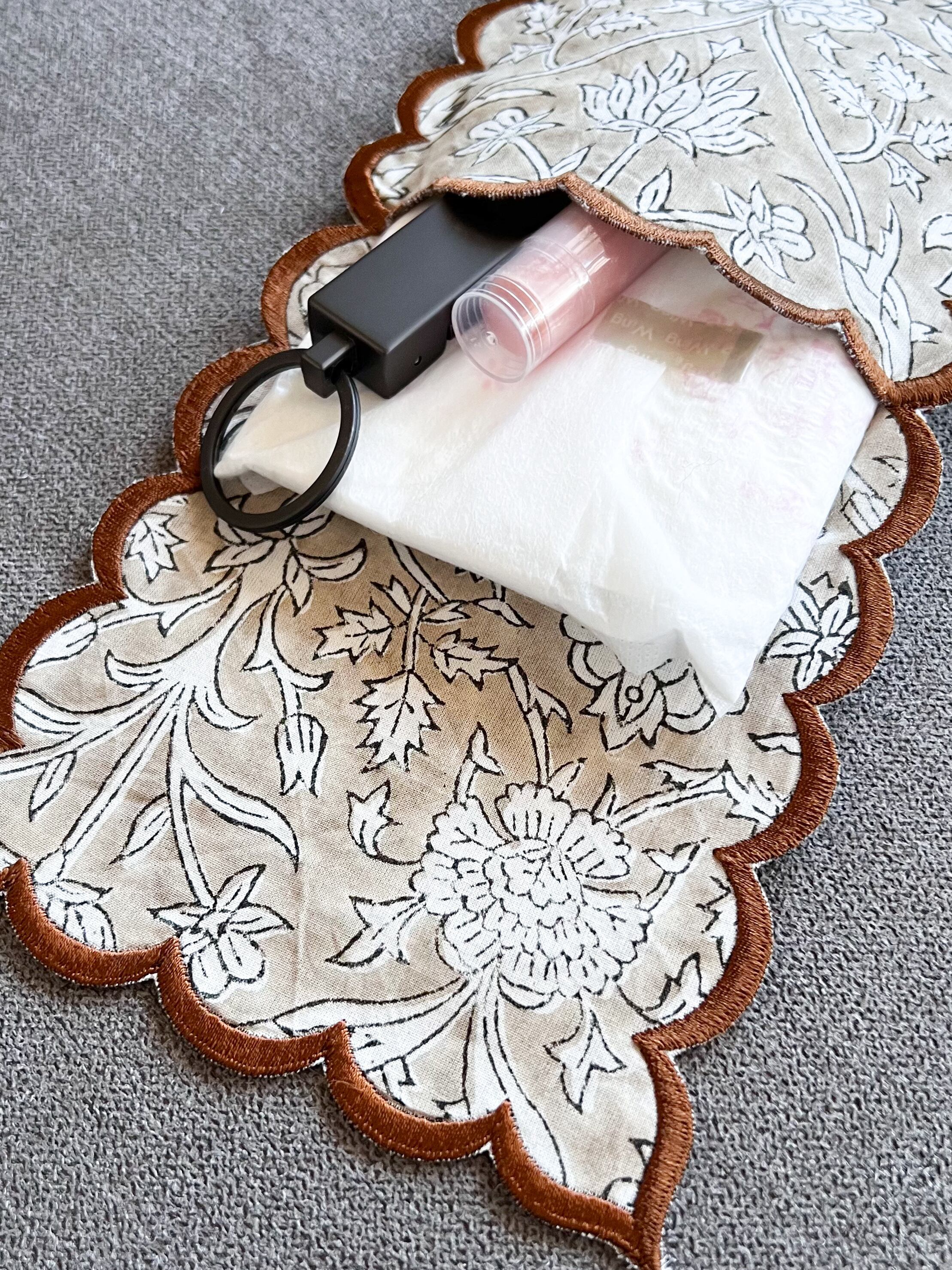 【12/12 12:00〜 販売開始 <数量限定•即納>】<Taupe Brown >ハンドブロックプリント スカラップ刺繍 ハンカチポーチ