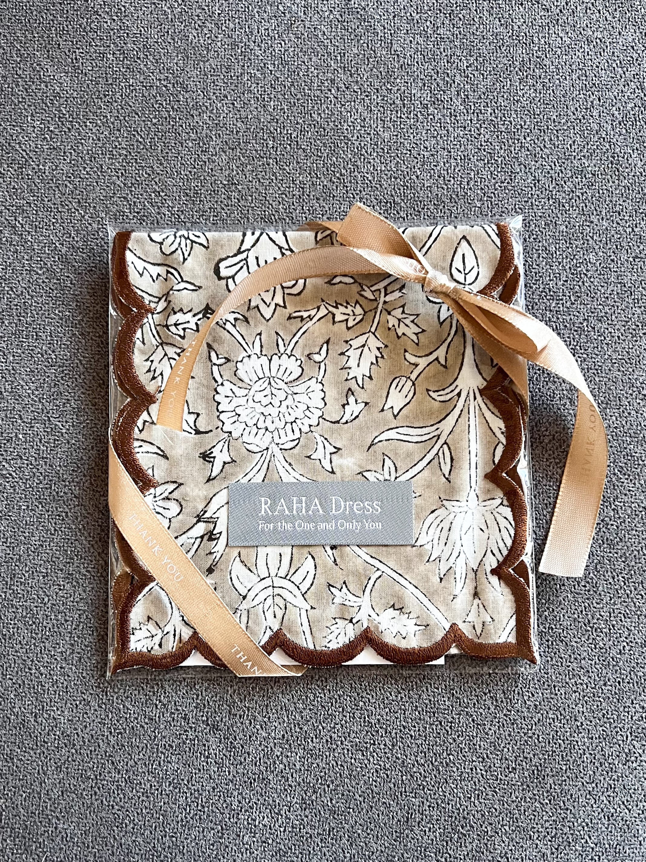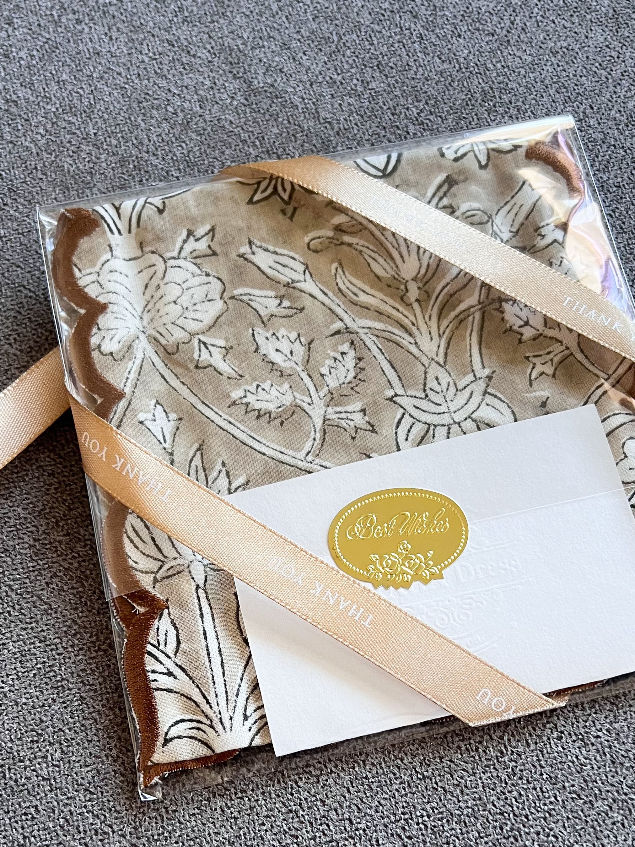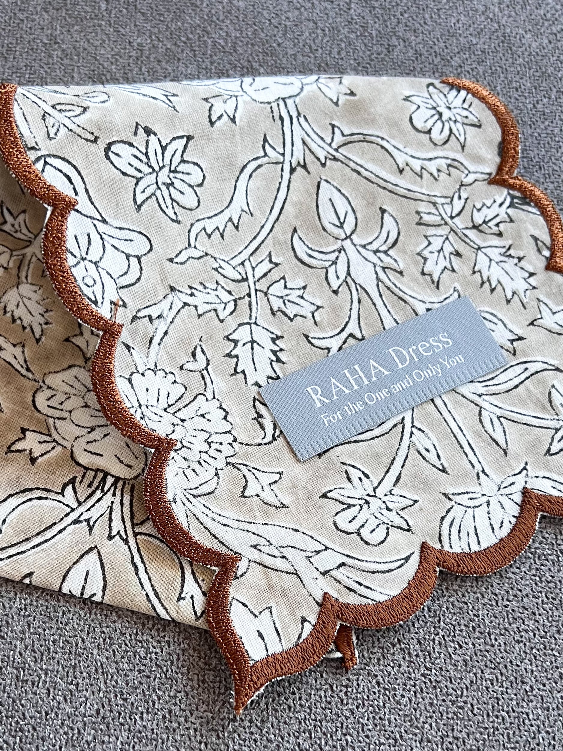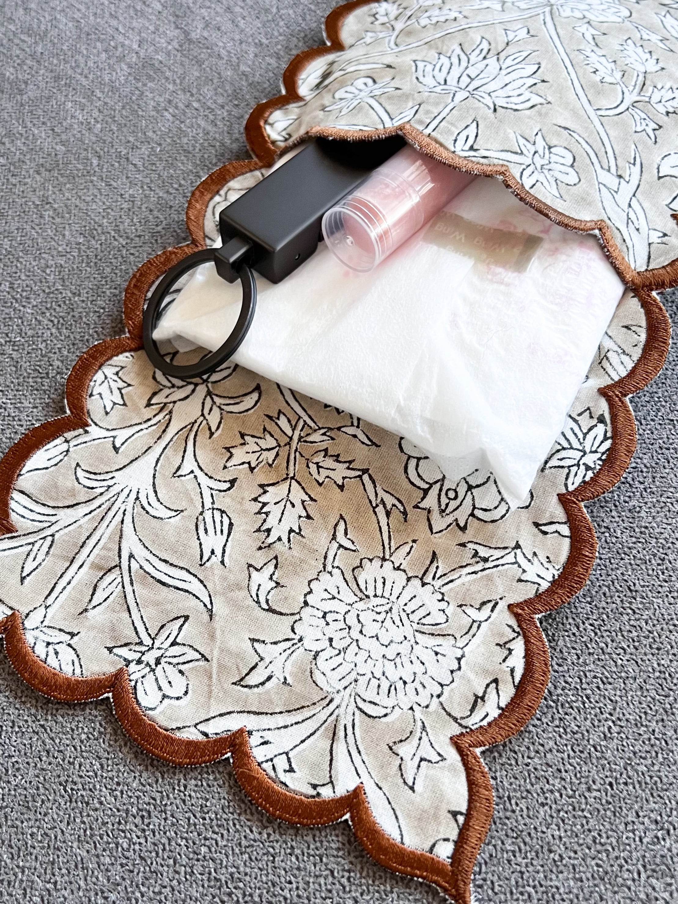 【数量限定 1/23~2/14】ハンドブロックプリント スカラップ刺繍 ハンカチポーチ<Taupe Brown >