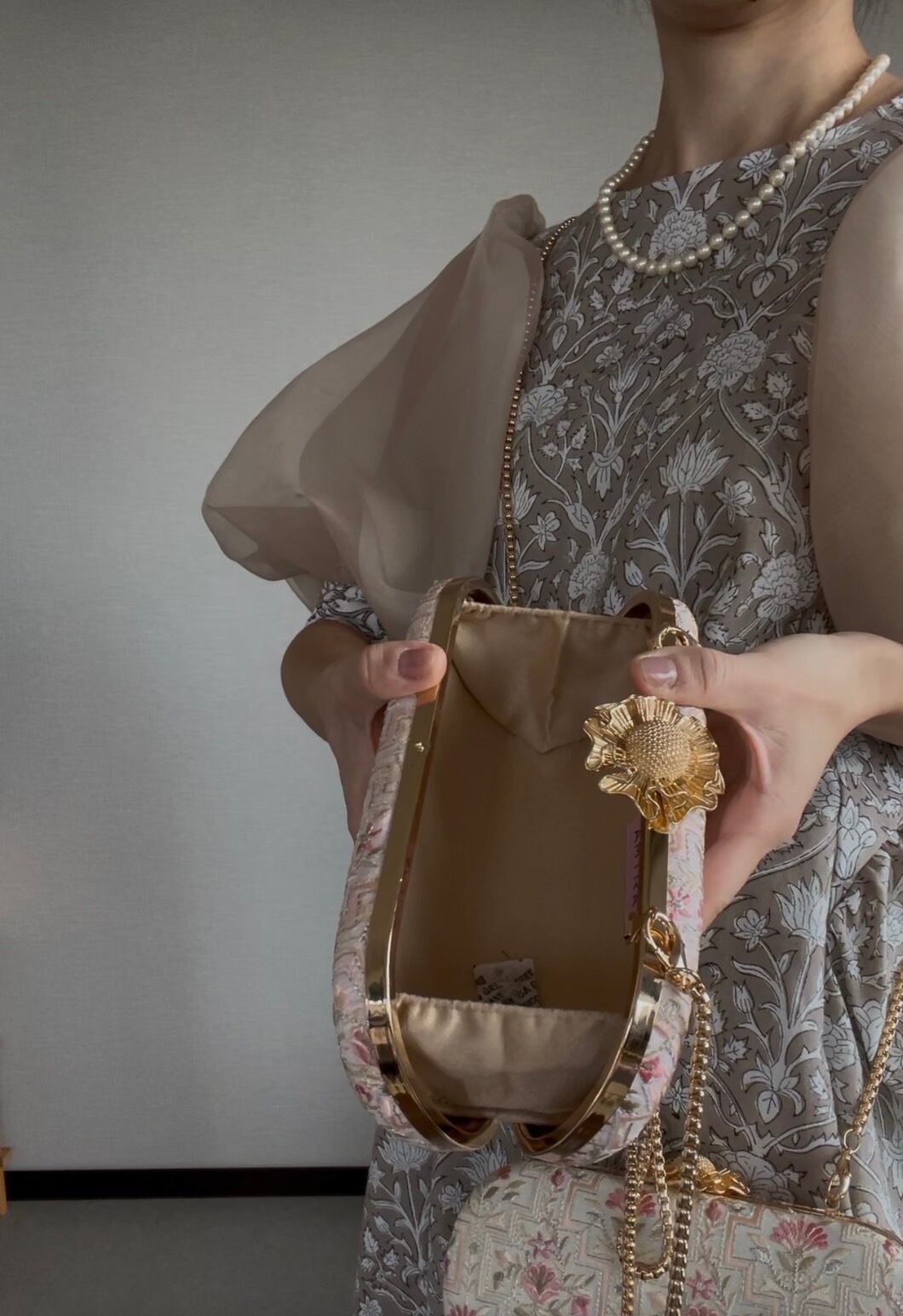 仕 様:ゴールドのメタルフレーム、ゴールドフローラルモチーフの留め具、取り外しチェーン