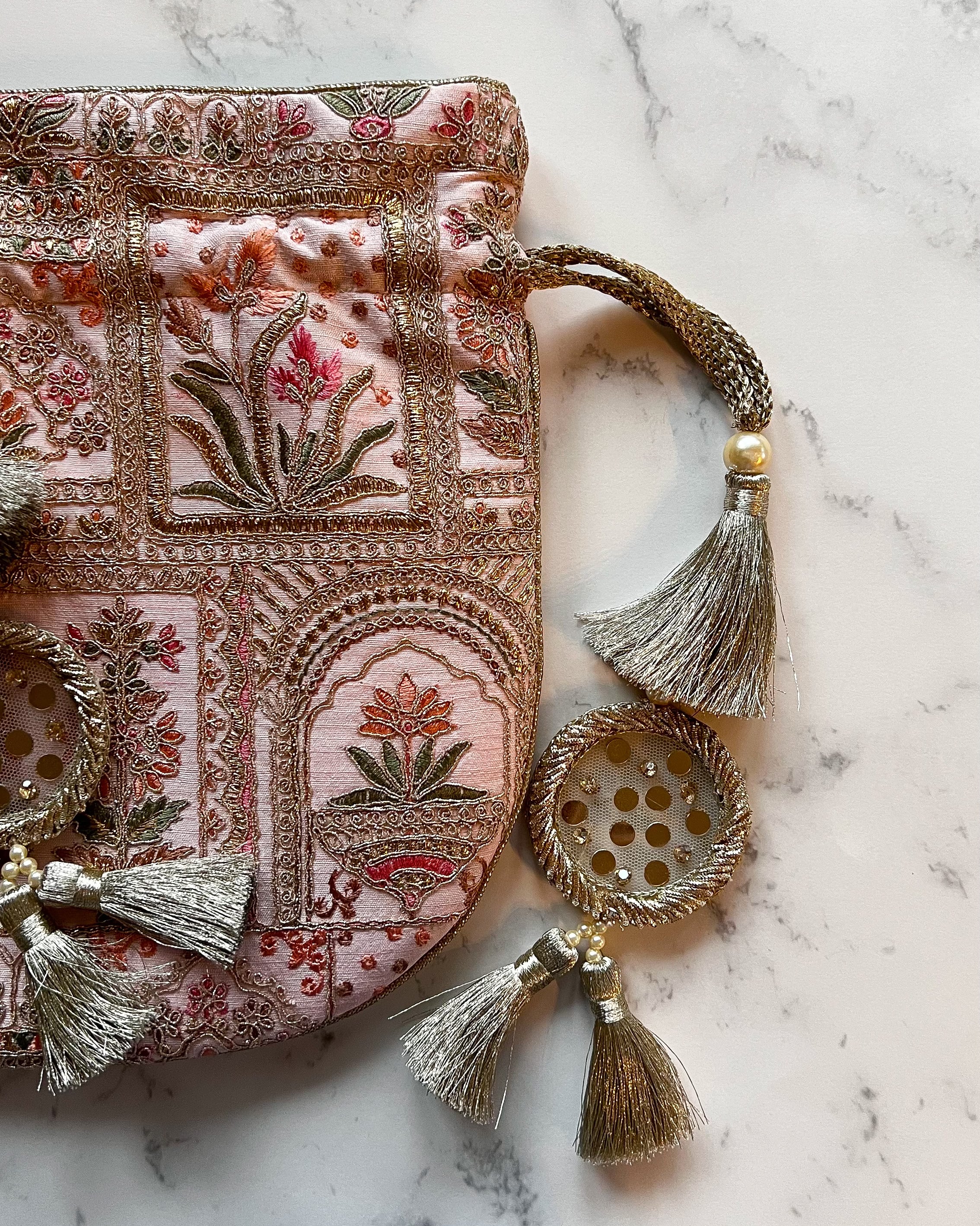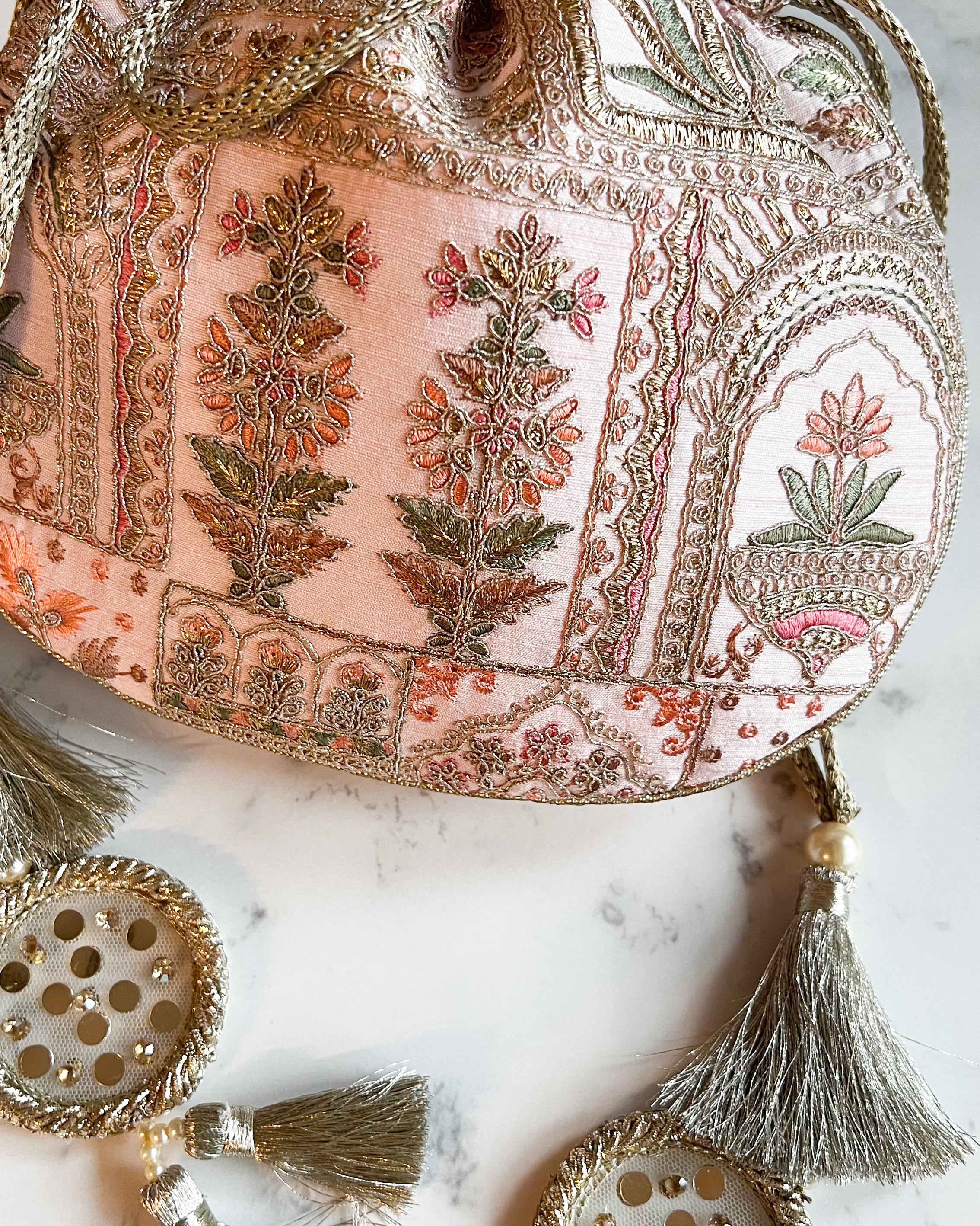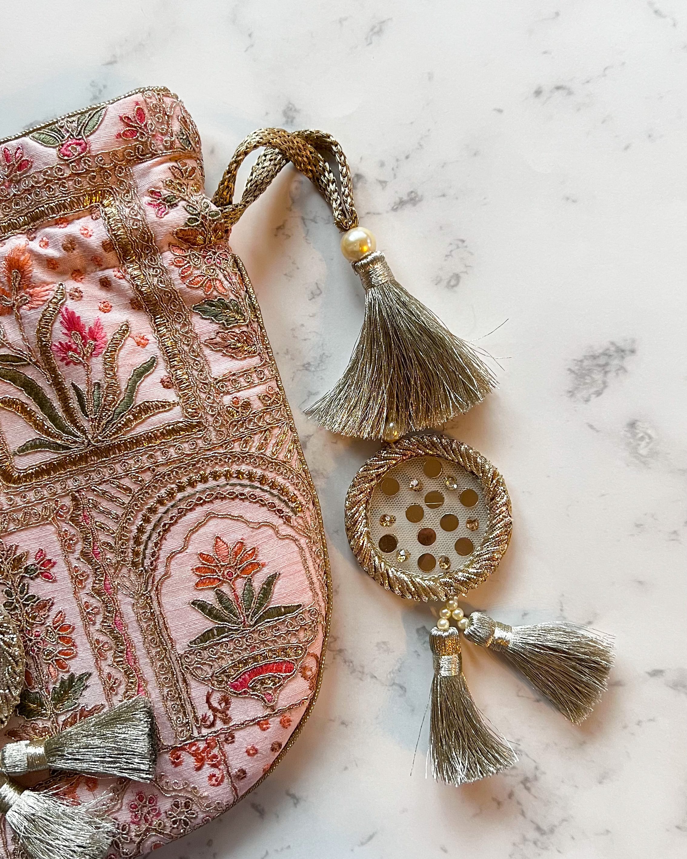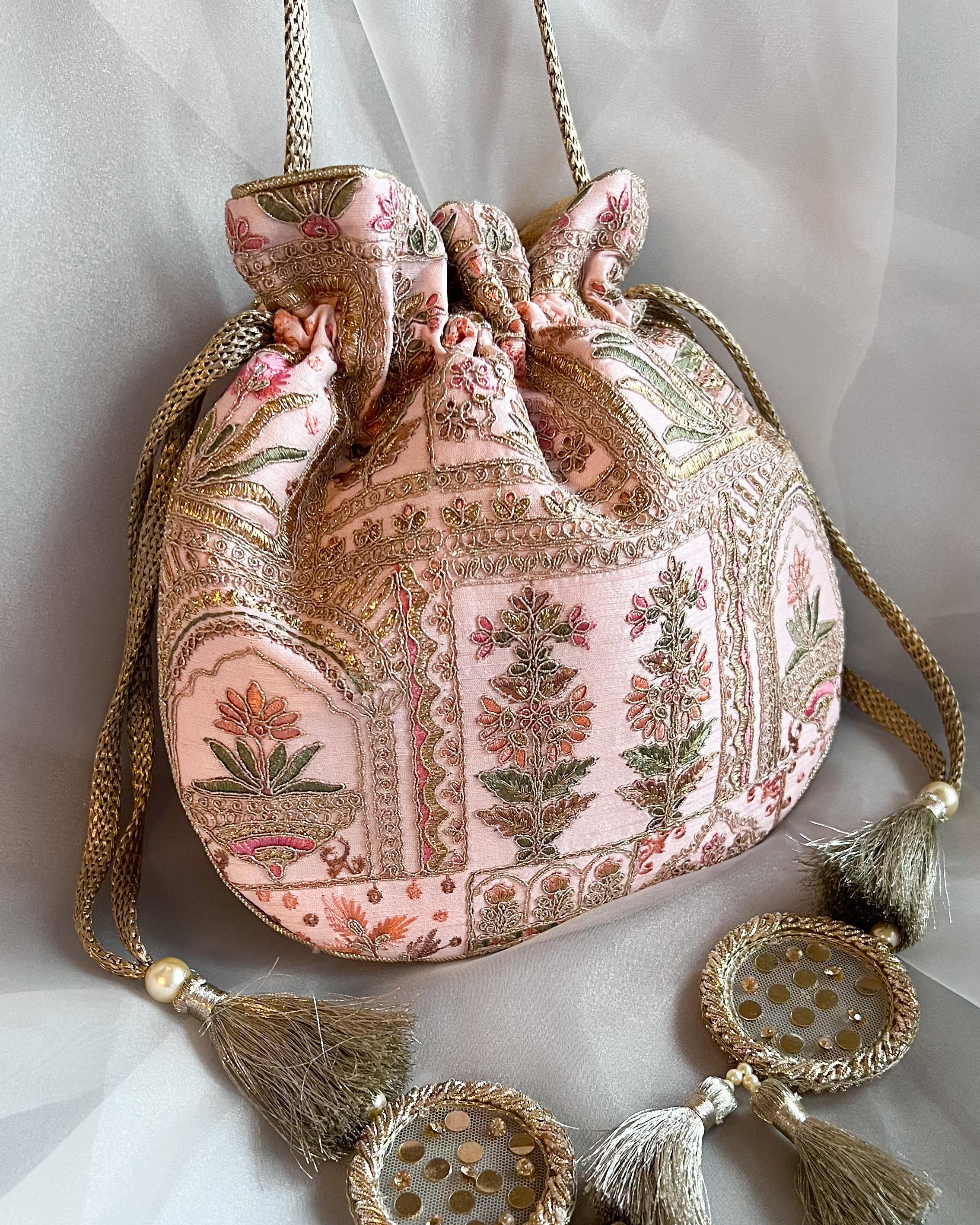 ・素材:刺繍入りポリシルク、ポリサテンの裏地、金糸を織り込んだドローストリングとハンドル、ハンドメイドのザリタッセル